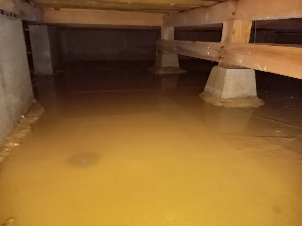 実際に床下に浸水した様子。一面に濁った水が溜まり、束石(床を支えるコンクリート柱)も水没しています。このように床下空間が水で満たされてしまうと、木材は水を吸いコンクリートも冷たく湿った状態に…。水が引いた後も泥や汚れが残り、放置すればカビや腐敗の原因となります。