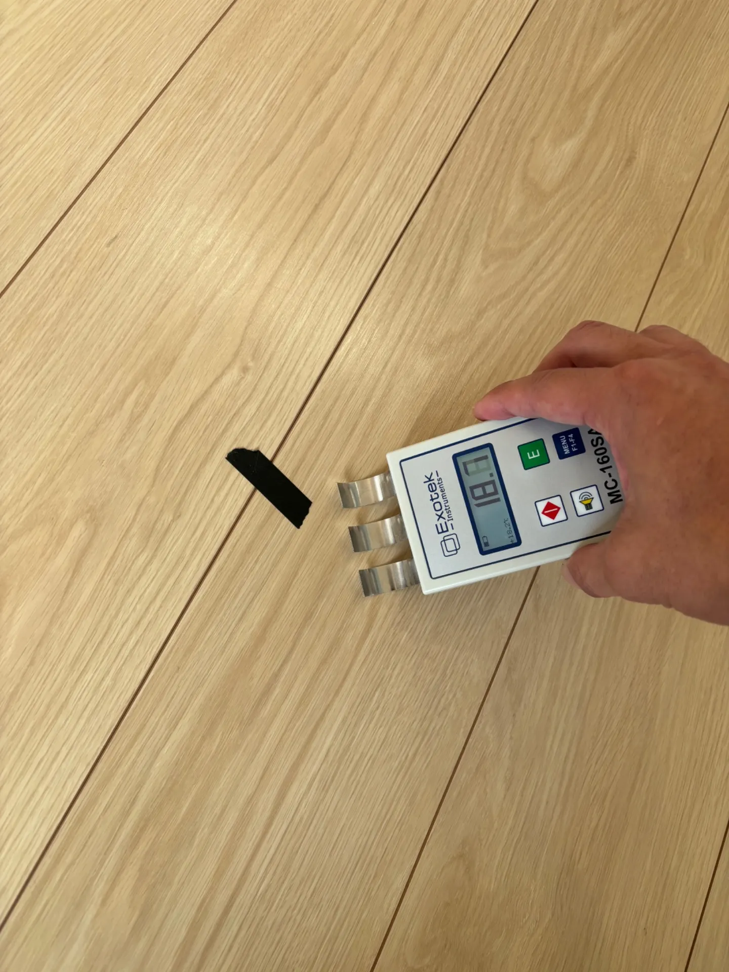 2.含水率の測定: カビの発生要因である「湿気」を数値化するため、含水率計による各部位の水分量チェックを行います。壁や床材の表面だけでなく内部(深さ数センチ)までプローブを差し込んで計測できる機器を使い、目に見えない部分まで含水率を確認します。この測定により、壁の中や床下でカビが発生・広がっていそうな領域を予測することができます。必要に応じて赤外線サーモグラフィーなどで水分の分布を調べることもあります。