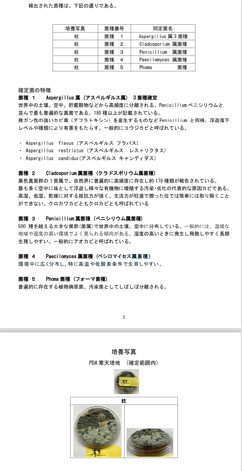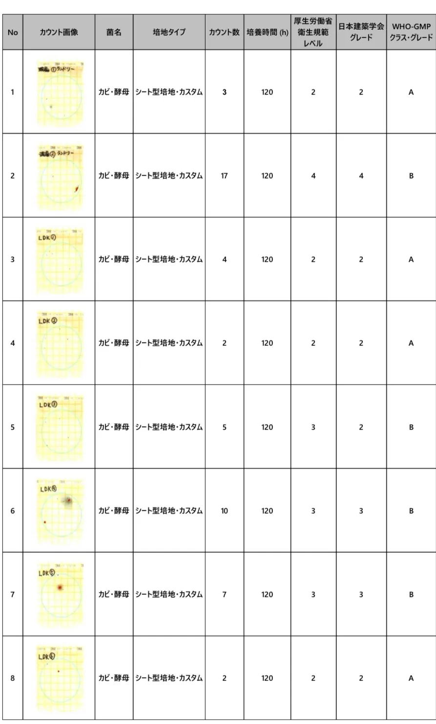 こうしたカビ検査の結果は、一般社団法人微生物対策協会にて分析され「カビの調査報告書」としてまとめられます。報告書には検出されたカビの種類やコロニー数、汚染度合いなどが詳細に記載され、現在お住まいのお部屋のカビ汚染状況を数値と写真で可視化して確認できます。