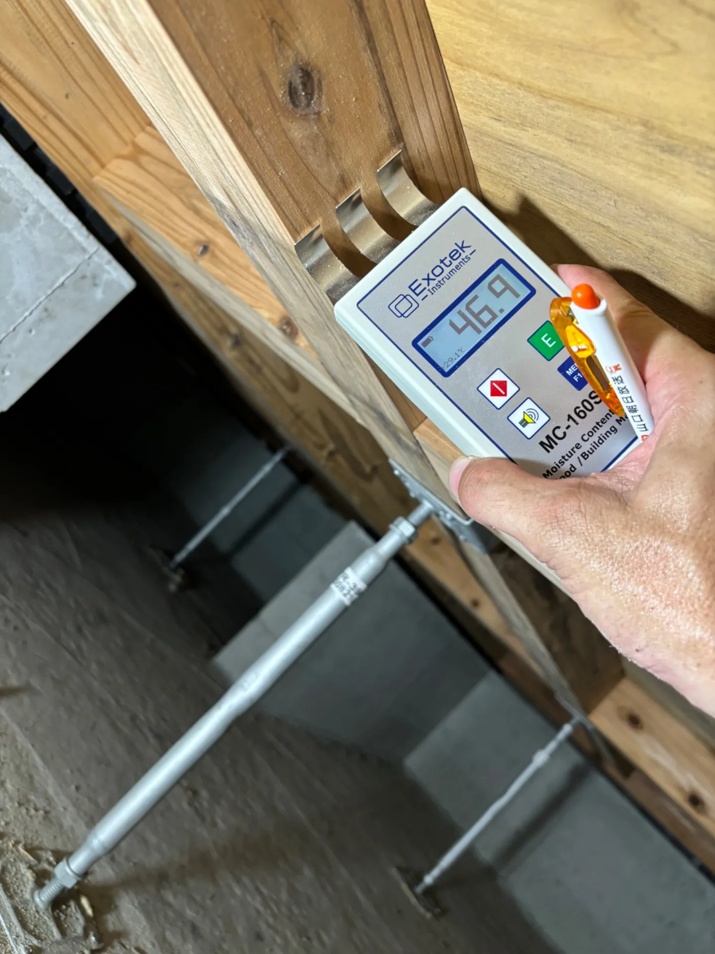 この住宅では、床下の湿度が常に非常に高く保たれていました。調査時には床下湿度がなんと81%にも達し、これは雨の日の屋外と同じくらいの湿度です。本来、室内の適正湿度は40~60%程度と言われていますが、梅雨時には床下湿度が97%にまで上昇することもあったとのことです。床下が常に蒸し風呂状態になっていたわけです。