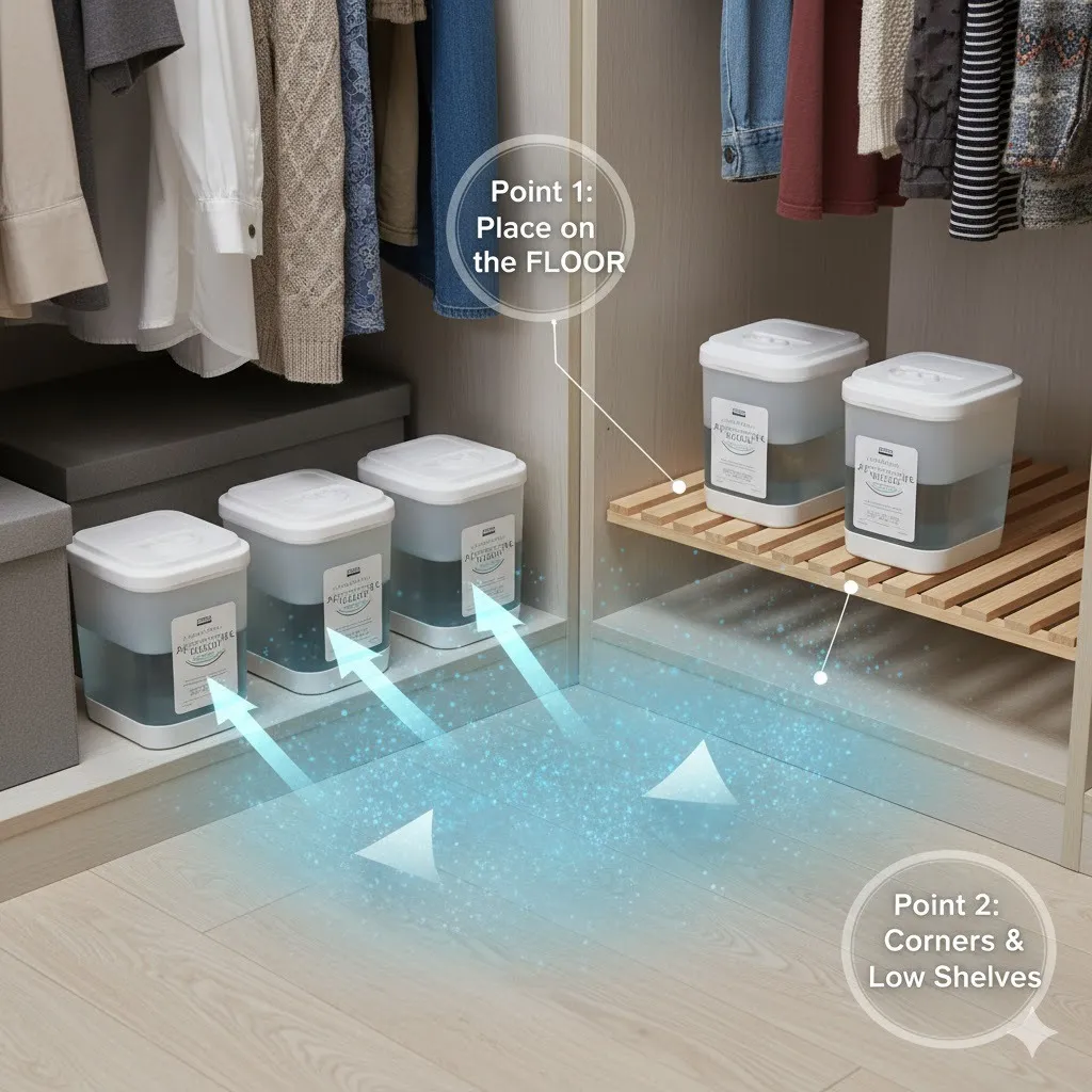湿気は空気より重いため、下にたまります。 置き型の除湿剤(タンク)は、クローゼットの「床の四隅」に置くのが最も効率的です。吊り下げ型は、衣類と衣類の間に設置し、置き型と併用するとさらに効果が高まります。