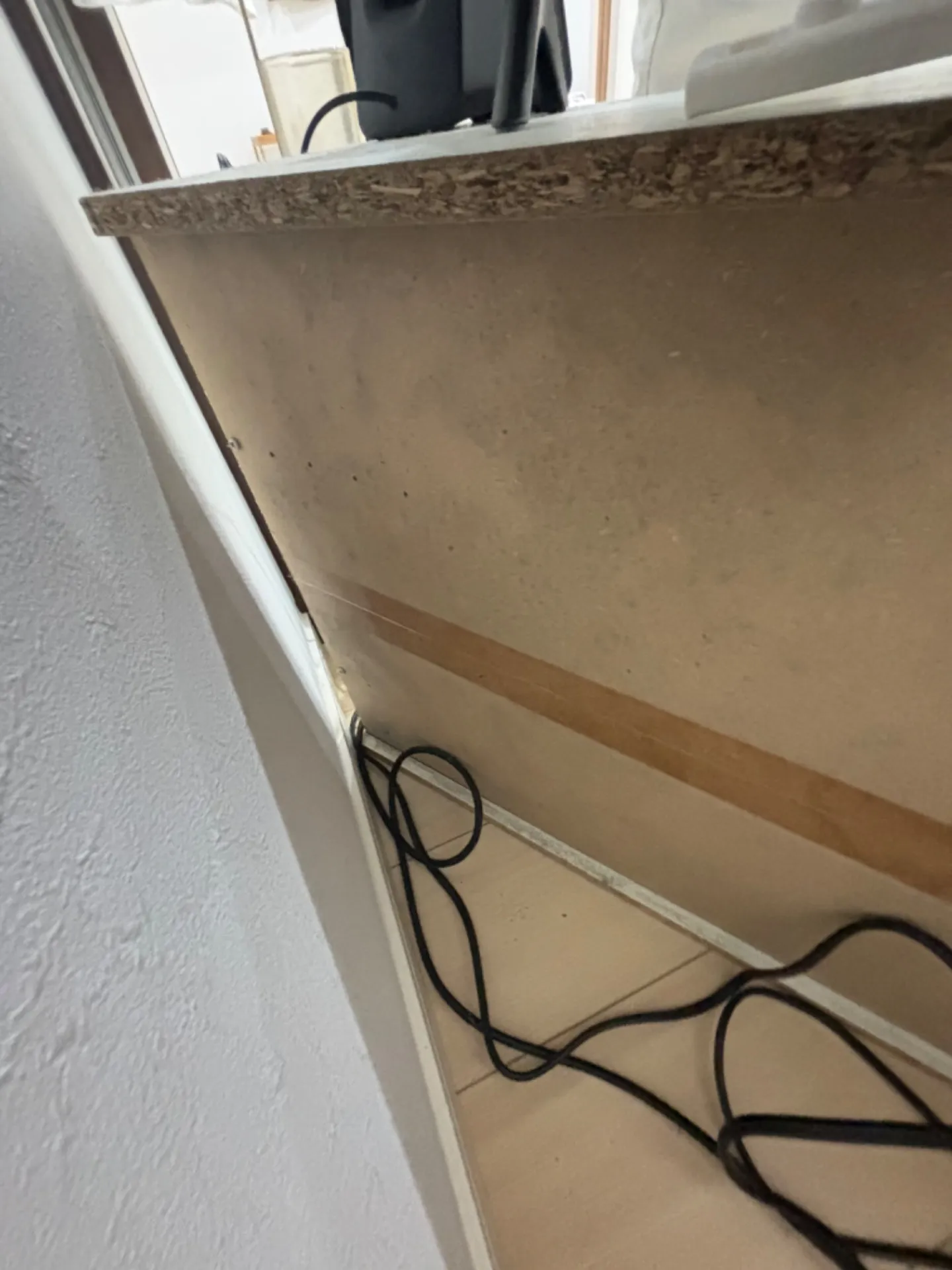 これは**テレビ台の裏側に生えた青カビ(粉カビ)**の例です。寝室など風通しが悪い場所では、このように家具の陰でカビが繁殖してしまうことがあります。普段見えない場所だけに発見が遅れがちですが、カビ臭さで気づくこともあります。「最近部屋がカビ臭いな」と感じたら、ベッドや家具を動かして壁や床をチェックしてみましょう。早期発見・早期対処が肝心です。