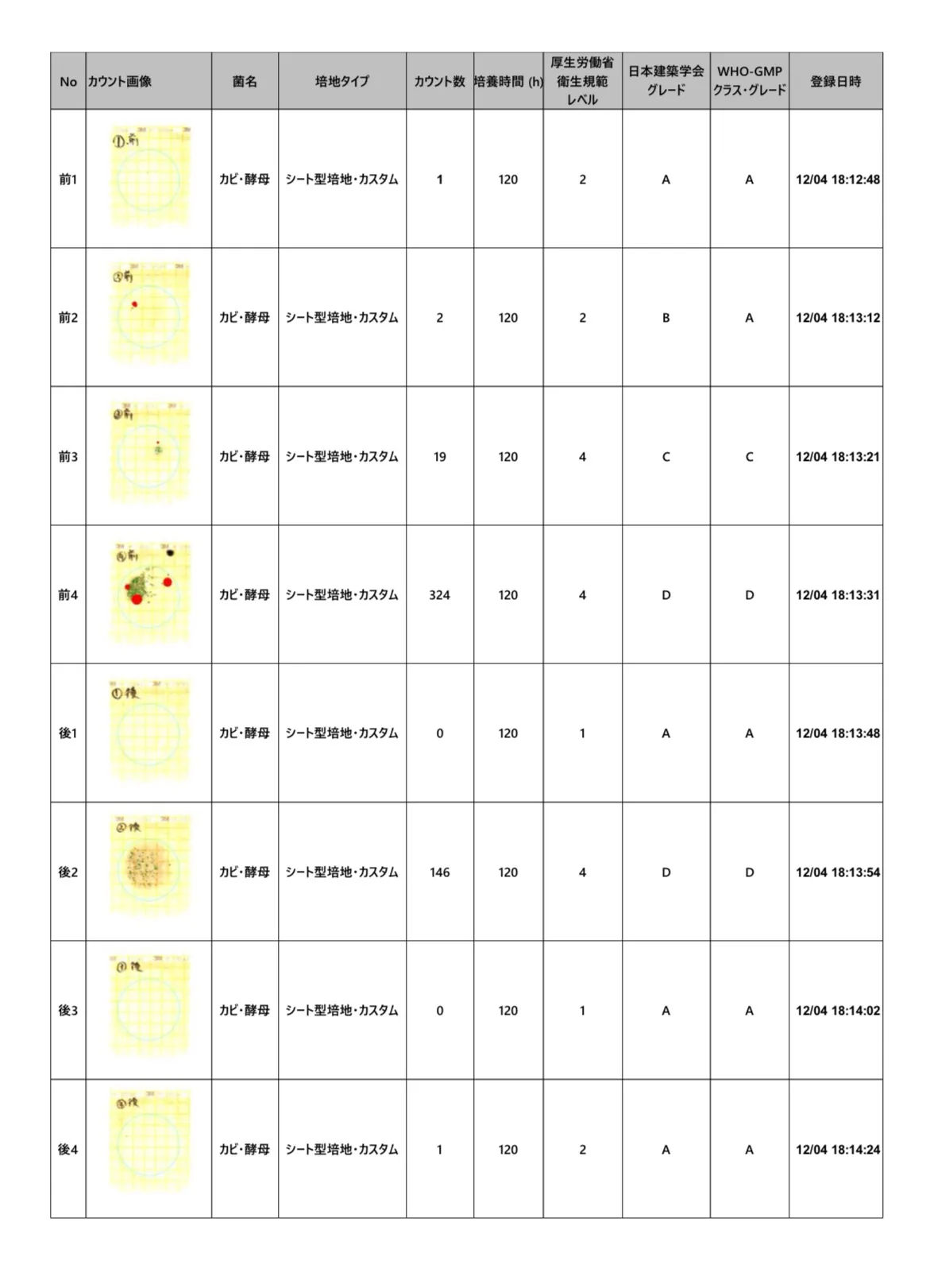 このカビ検査の大きな特徴は施工前と施工後で汚染レベルを比較できることです。