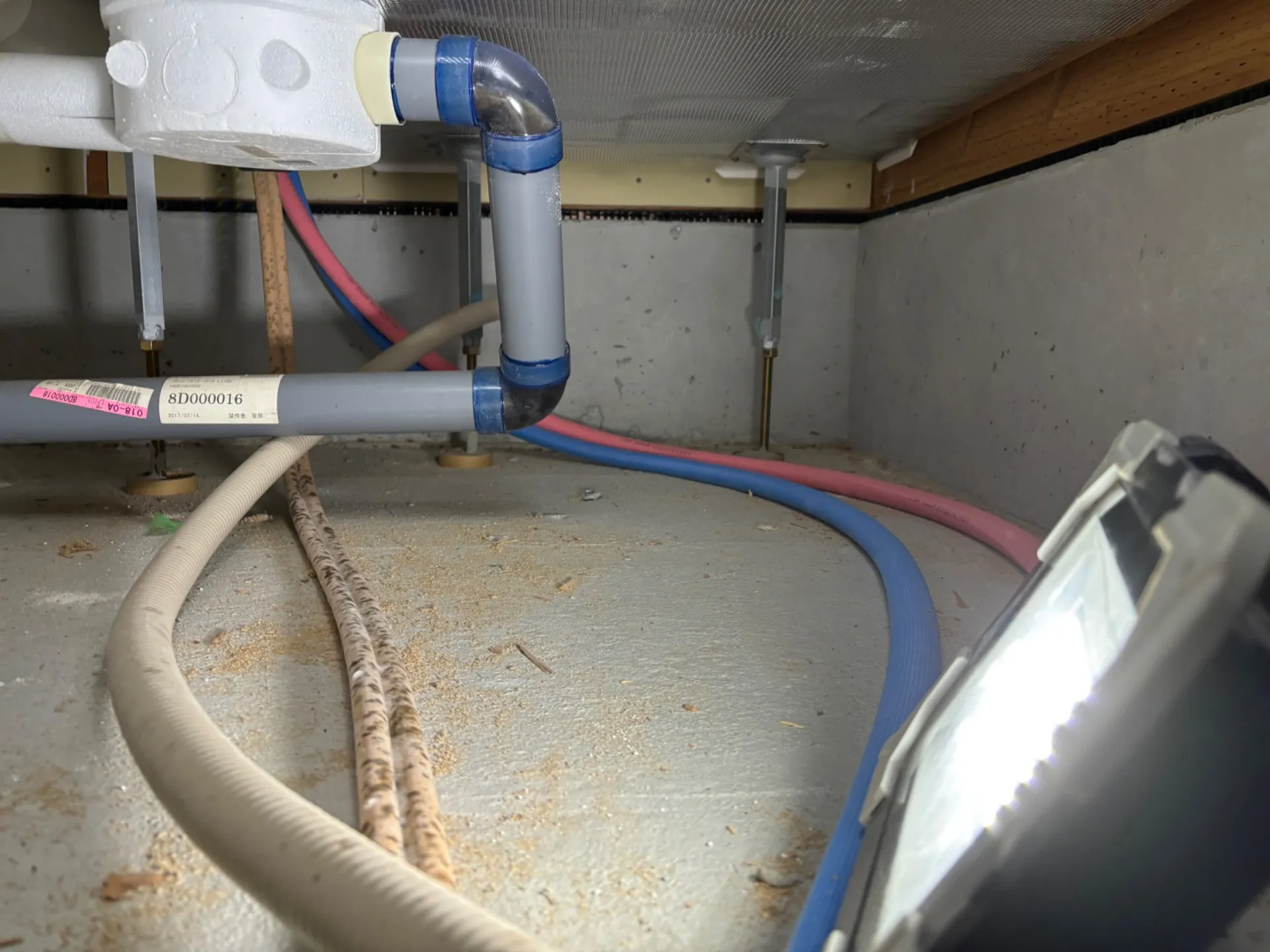 これは最も深刻なケースです。 配管の接続不良や、経年劣化によるひび割れから、ポタポタと微細な水漏れが起きている場合があります。大量の水漏れなら水道代の跳ね上がりで気づきますが、少量の水漏れは気づきません。 漏れ出た水が床下のコンクリートに水たまりを作り、それが蒸発して床下全体の湿度を極限まで引き上げ、配管だけでなく家の土台全体をカビだらけにしてしまいます。